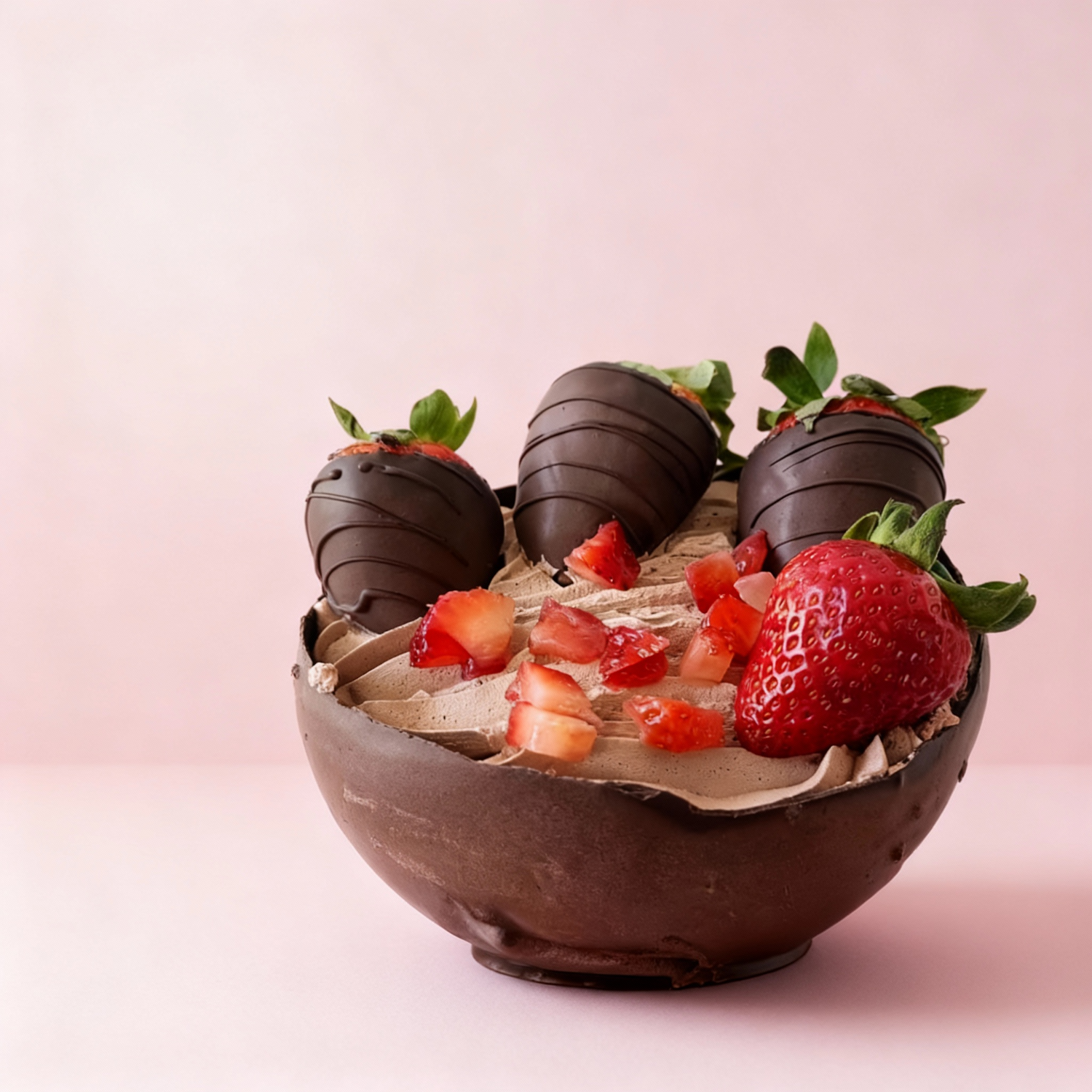 A handcrafted chocolate shell filled with creamy mousse and fresh strawberries — a perfect balance of elegance and indulgence.